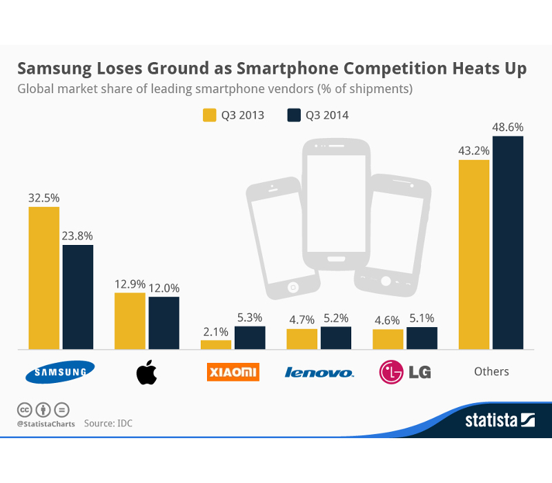 Statista have released a graphic that shows the drop in market share that Samsung have experienced over the last year. The graph, which shows the share of the mobile device market by the main players, also hints at other interesting facts. Whilst Samsung and Apple have both seen reductions in market share, Xiaomi has seen an increase in sales along with Lenovo. LG have also worked hard to increase their position and their G2 and G3 handsets have been widely seen as some of the best devices on the market. The Other category, which includes HTC and the Nexus brand, has also gained more share, understandably as both HTC and the Nexus range of devices have been applauded recently.